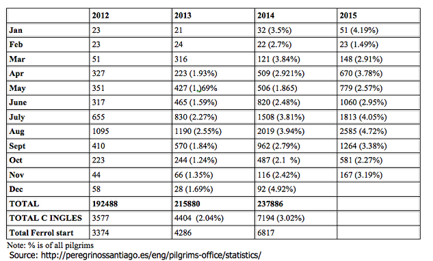 Pilgrims from England and the 'English Way' (Camino Inglés) from la Coruña in to Santiago de Compostela in Galicia, north west Spain. (A briefing note by Marion Marples)